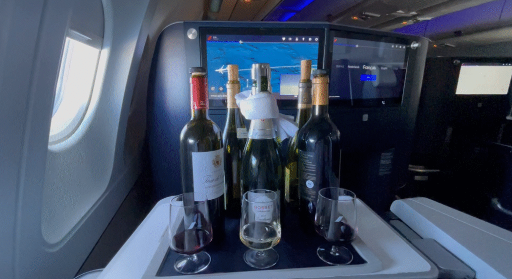 A carta de vinhos da Air France reforça a tradição da companhia nesse aspecto. Havia cerca de cinco rótulos franceses de alto nível, com uma seleção que inclui Champagnes, Bordeaux, Borgonha e opções de vinhos brancos e tintos, adaptados para o paladar a bordo. Todos os rótulos são de diversas regiões como Vale do Rhône, Languedoc-Roussillon, Vale do Loire e Alsácia.