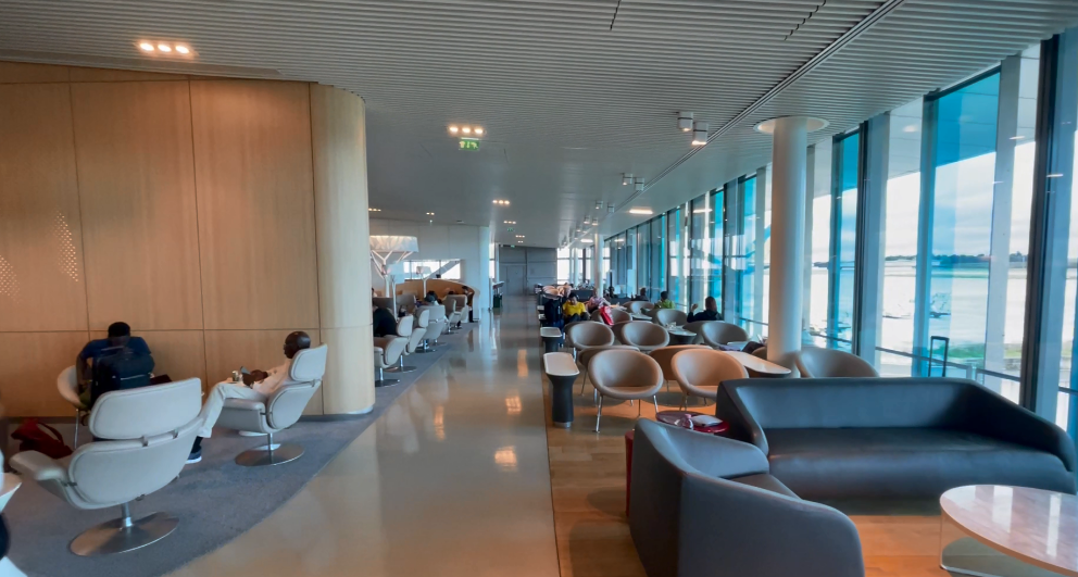 Após a imigração, segui para o Terminal 2E, área dos portões M, onde fica o lounge utilizado para o voo com destino a Fortaleza, operado por um Airbus A330-200. A sala impressiona positivamente logo na chegada. O ambiente é amplo, silencioso e bem decorado, transmitindo uma sensação clara de conforto e organização, mesmo com bom movimento.