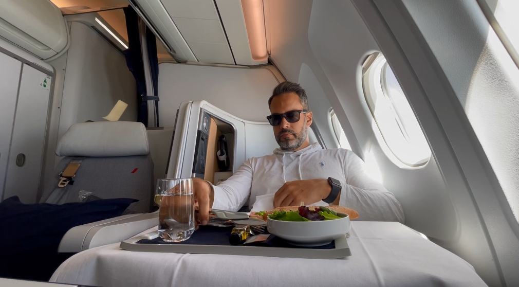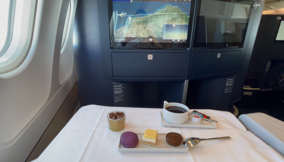 Como prato principal, optei pelo peito de frango, uma escolha segura e que já havia me surpreendido positivamente em um voo anterior da Air France para Dubai. Novamente, a execução foi muito boa, com carne bem preparada e acompanhamentos equilibrados. O serviço é feito de forma progressiva, com a troca dos pratos conforme o passageiro avança na refeição, algo que melhora bastante a experiência.