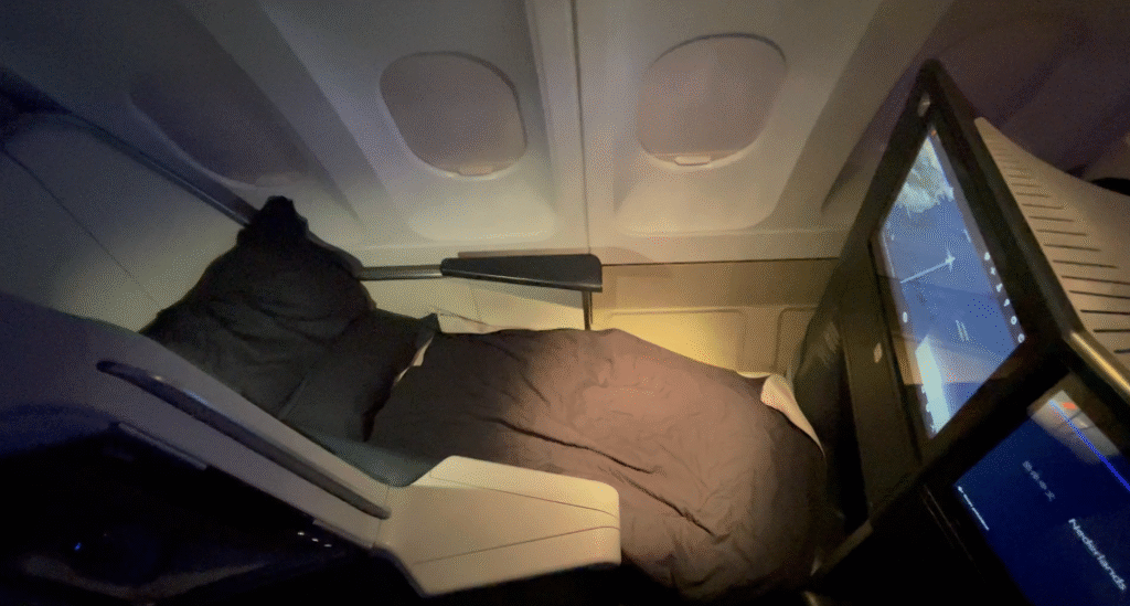 Após a refeição, ajustei a poltrona para a posição cama totalmente flat. O descanso foi confortável e silencioso, permitindo recuperar bem as energias durante o voo.