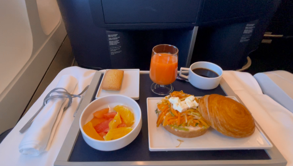 O serviço de bordo confirmou um dos pontos fortes da Air France. A entrada veio acompanhada de pães franceses, incluindo a tradicional baguete, além de pequenos aperitivos típicos da companhia.