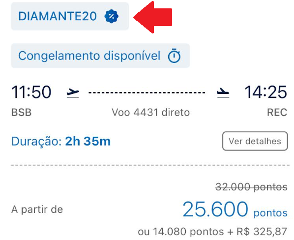 No caso de um cliente Diamante, o desconto de 20% já aparece aplicado no momento da emissão. Em uma pesquisa entre Brasília (BSB) e Recife (REC), por exemplo, o valor final ficou em 25.600 pontos + taxas, mostrando na tela a redução destacada de forma clara.