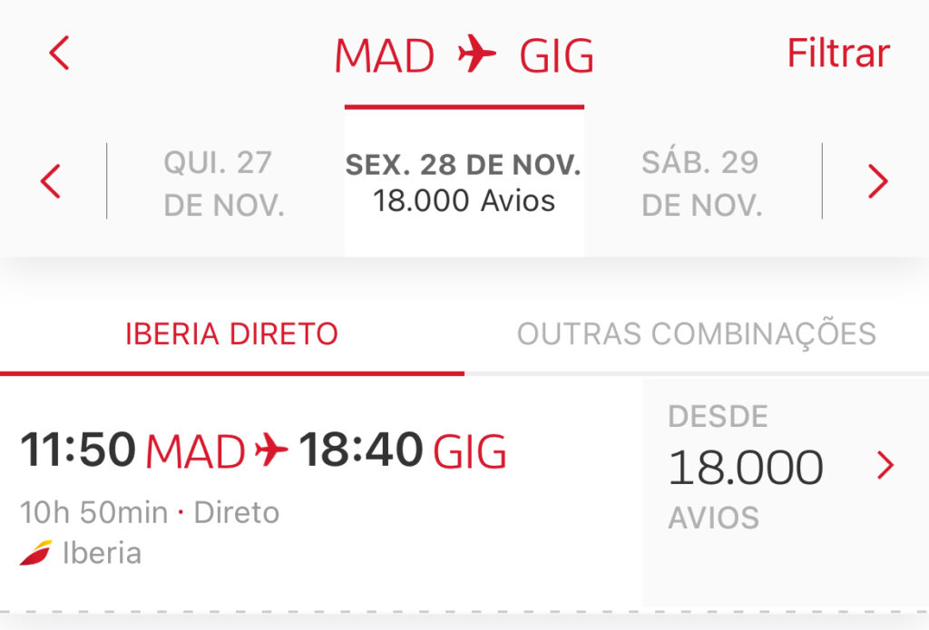 - Madrid (MAD) – Rio de Janeiro (GIG), em classe econômica, por 18.000 Avios – o trecho;