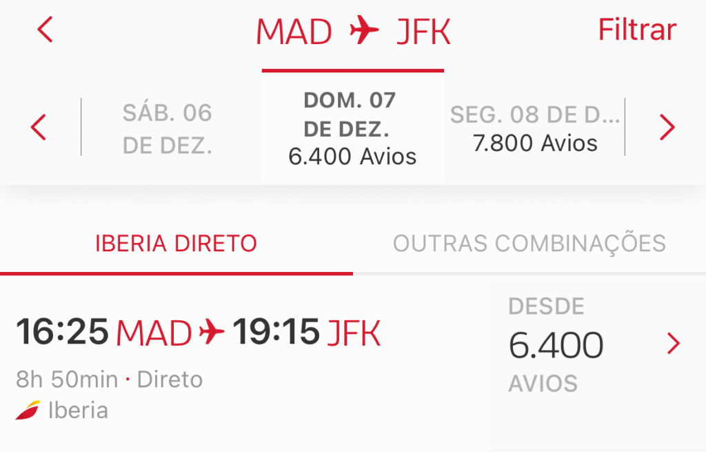 - Madrid (MAD) – Nova York (JFK), em classe econômica, por 6.400 Avios – o trecho;