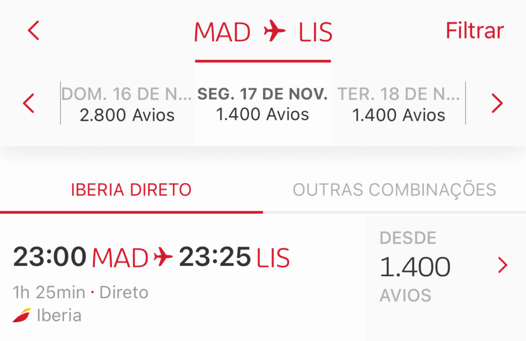 - Madrid (MAD) – Lisboa (LIS), em classe econômica, por 1.400 Avios – o trecho;