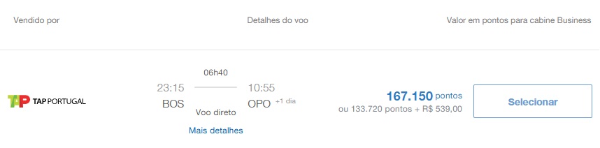 • Boston (BOS) – Porto (OPO): 167.150 pontos + taxas, TAP Air Portugal