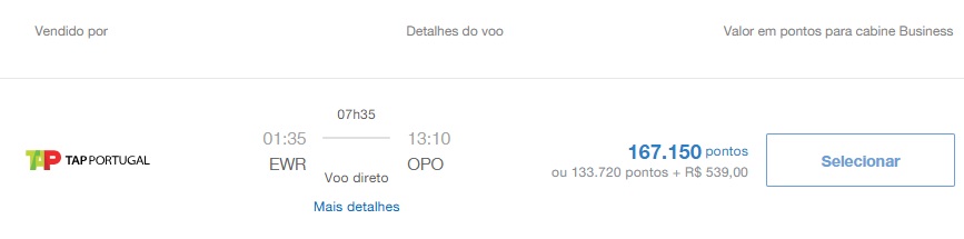 • Newark (EWR) – Porto (OPO): 167.150 pontos + taxas, TAP Air Portugal