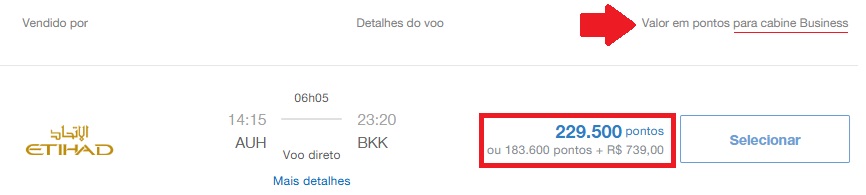• Abu Dhabi (AUH) – Bangkok (BKK): 229.500 pontos + taxas, Etihad