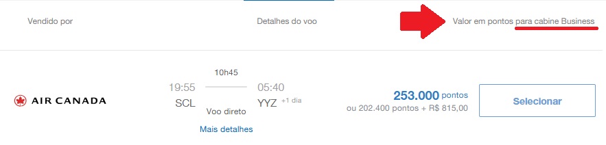 • Santiago (SCL) – Toronto (YYZ): 253.000 pontos + taxas, Air Canada
