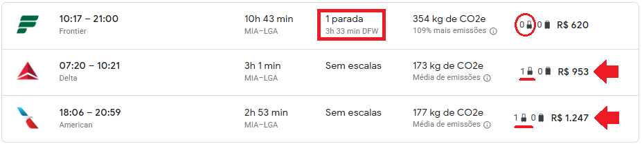 | EUA | Miami – Nova York | Frontier | Com conexão (Dallas) | R$ 620,00 + taxas | USD 116,18 | Sem mala de mão/despachada |