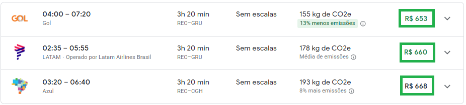 | Brasil | Recife – São Paulo | Gol / Latam / Azul | Direto | R$ 660,33 + taxas | USD 123,73 | Inclui mala de mão |