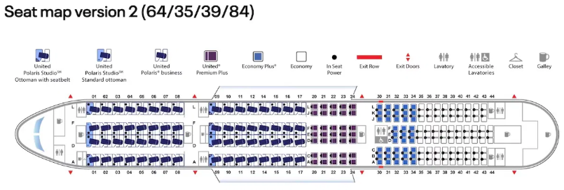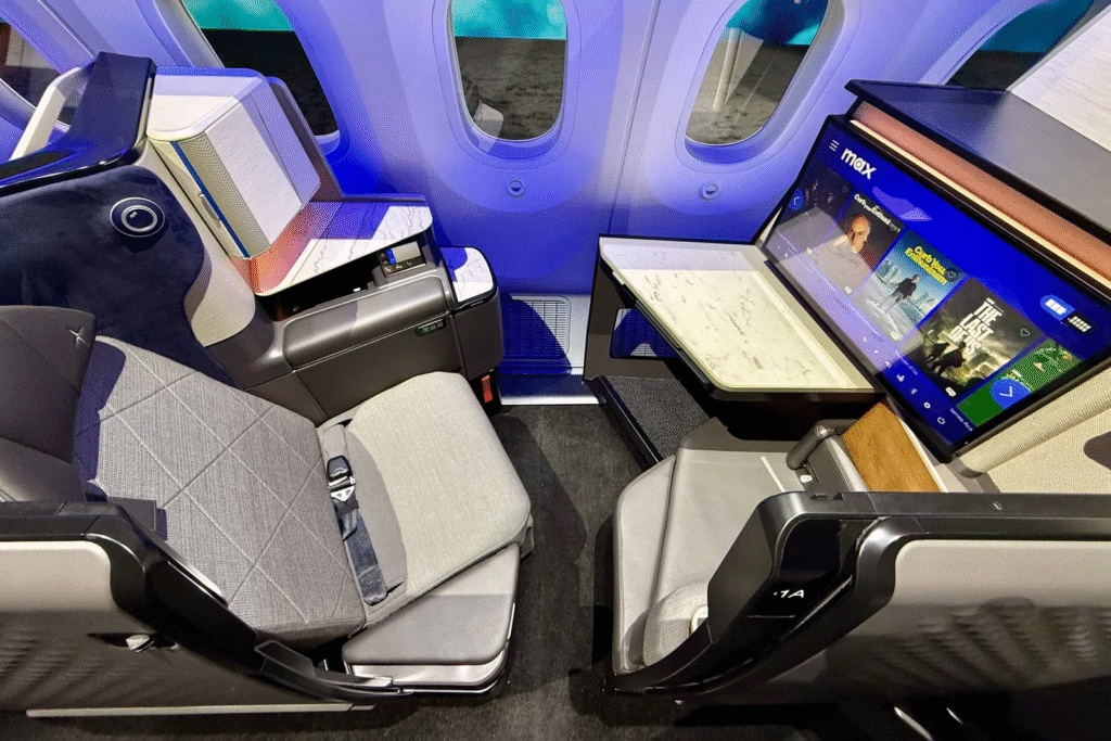 Na área frontal, os assentos centrais ficam inclinados para dentro. Já na parte traseira, eles se inclinam para fora. Essa variação acontece porque a United adotou o produto Elevate Ascent, algo pouco comum em widebodies comerciais.
